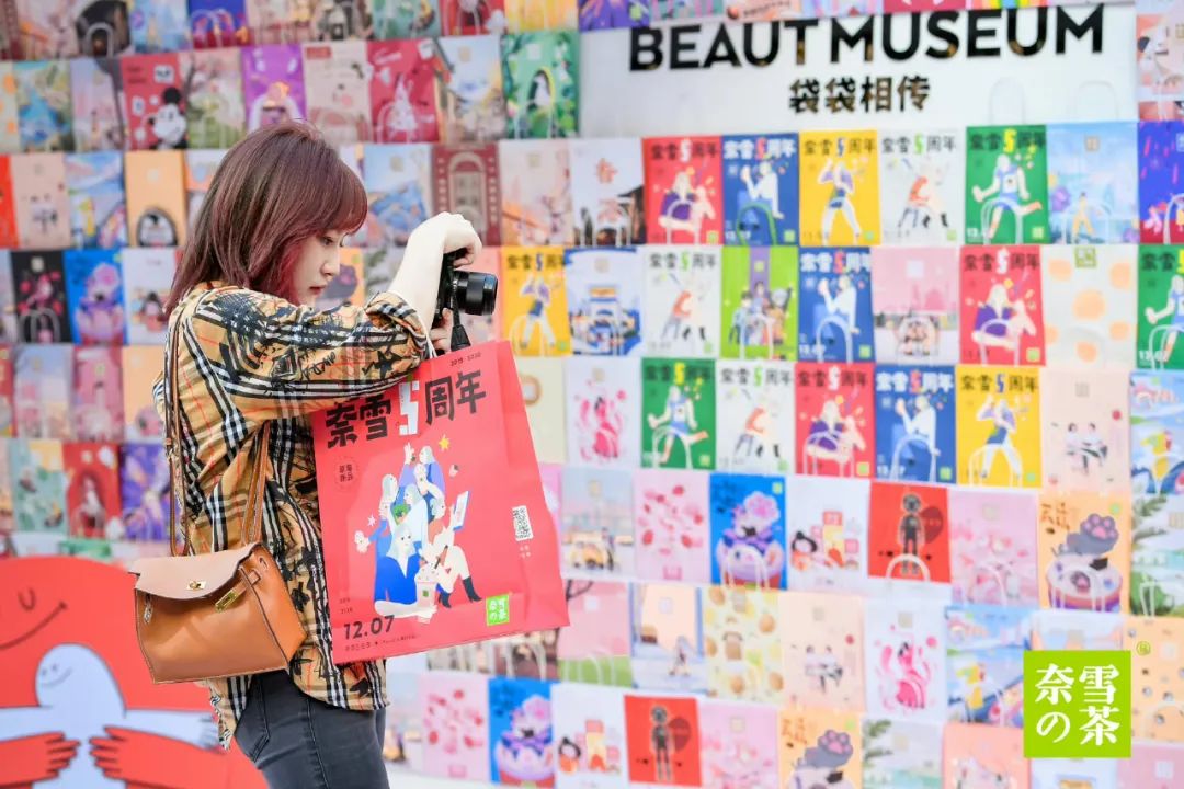 比如,在去年五周歲生日季的活動中,奈雪就打出“127奈雪節”的概念,并以“袋袋相傳”為主題,將5年來的主題紙袋做成一面巨幅品牌墻,仿佛一座時光機,載著粉絲再次回到與奈雪初次見面的地點。